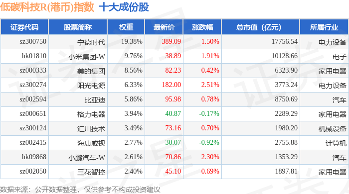 低碳科技R(港币)(483161)指数十大成份股详情如下: