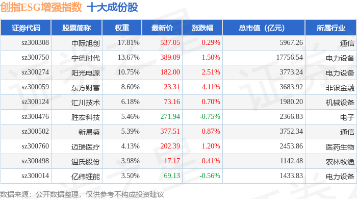 证券之星消息,12月5日,创指ESG增强(970034)指数报收于2950.68点,涨1.22%,成交1067.45亿元,换手率1.9%。当日该指数成份股中,上涨的有32家,天孚通信以6.22%的涨幅领涨,下跌的有8家,华利集团以6.09%的跌幅领跌。