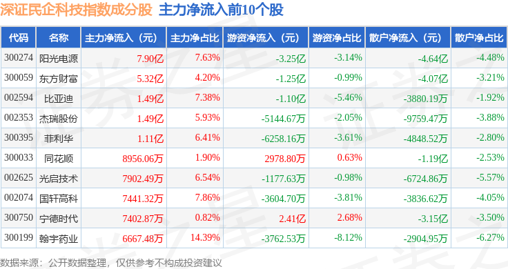 资金流向方面,深证民企科技(970059)指数成份股当日主力资金净流入合计6.15亿元,游资资金净流出合计1.78亿元,散户资金净流出合计4.38亿元。成份股资金流向详情见下表: