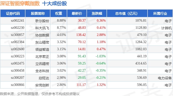 深证智能穿戴(970074)指数十大成份股详情如下: