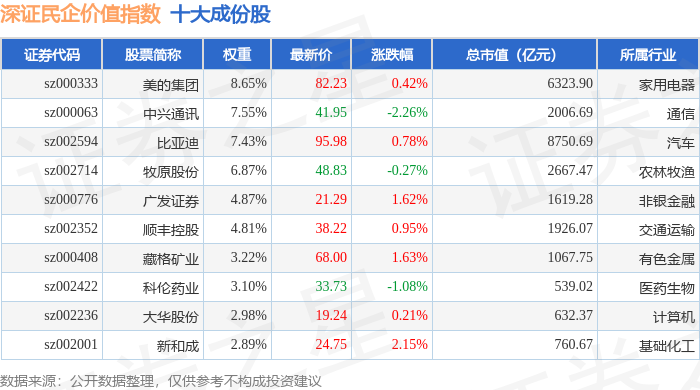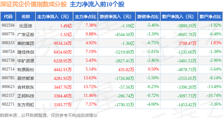 资金流向方面,深证民企价值(970072)指数成份股当日主力资金净流出合计9.12亿元,游资资金净流出合计2.72亿元,散户资金净流入合计11.84亿元。成份股资金流向详情见下表: