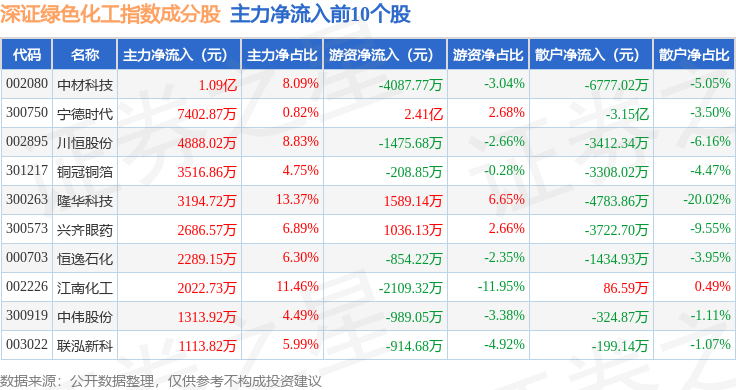 资金流向方面,深证绿色化工(970076)指数成份股当日主力资金净流出合计5.6亿元,游资资金净流出合计1877.42万元,散户资金净流入合计5.78亿元。成份股资金流向详情见下表: