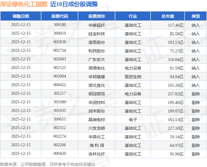近10日内深证绿色化工(970076)指数成份股做了调整,新纳入了8只股票,剔除了8只股票。