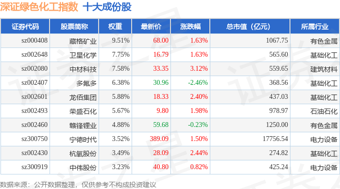证券之星消息,12月5日,深证绿色化工(970076)指数报收于1632.07点,涨1.25%,成交306.68亿元,换手率1.5%。当日该指数成份股中,上涨的有39家,东岳硅材以4.59%的涨幅领涨,下跌的有10家,多氟多以2.46%的跌幅领跌。