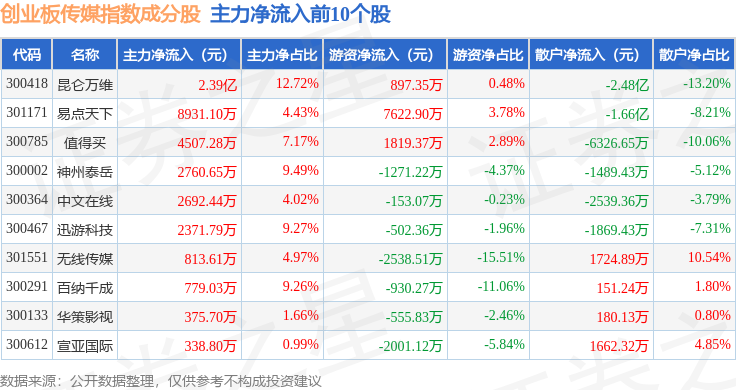 资金流向方面,创业板传媒(970084)指数成份股当日主力资金净流入合计4389.56万元,游资资金净流出合计3374.25万元,散户资金净流出合计1015.31万元。成份股资金流向详情见下表: