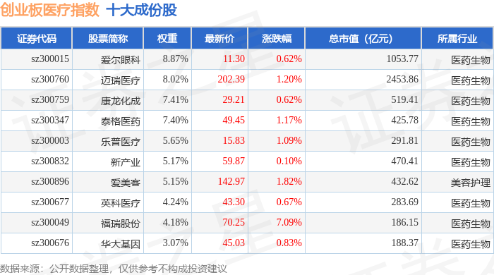 创业板医疗(970082)指数十大成份股详情如下: