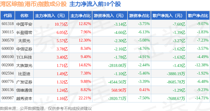资金流向方面,湾区综指(港币)(980004)指数成份股当日主力资金净流出合计10.92亿元,游资资金净流出合计12.51亿元,散户资金净流入合计23.45亿元。成份股资金流向详情见下表:
