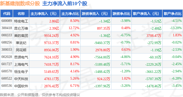 资金流向方面,新基建(980029)指数成份股当日主力资金净流出合计28.94亿元,游资资金净流入合计7.94亿元,散户资金净流入合计21.0亿元。成份股资金流向详情见下表:
