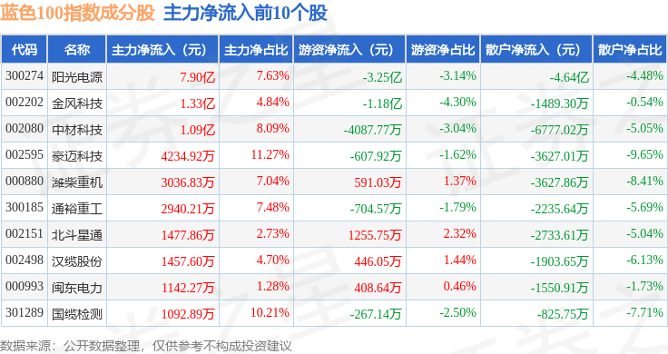 资金流向方面,蓝色100(980068)指数成份股当日主力资金净流入合计8.83亿元,游资资金净流出合计5.81亿元,散户资金净流出合计3.01亿元。成份股资金流向详情见下表: