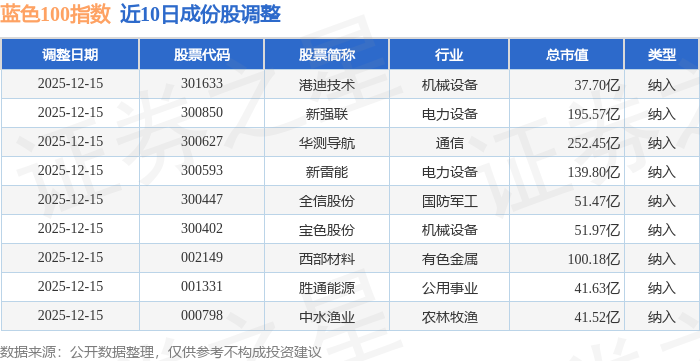近10日内蓝色100(980068)指数成份股做了调整,新纳入了9只股票。