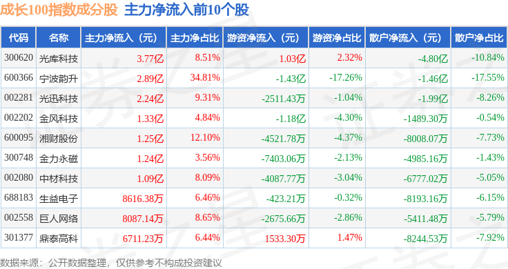 资金流向方面,成长100(980080)指数成份股当日主力资金净流出合计3.08亿元,游资资金净流入合计2.32亿元,散户资金净流入合计1.08亿元。成份股资金流向详情见下表: