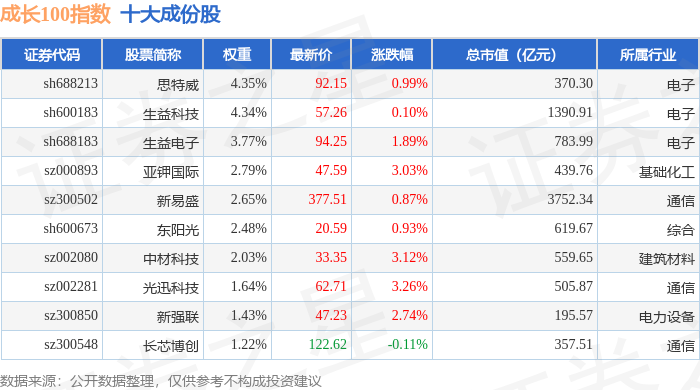 证券之星消息,12月5日,成长100(980080)指数报收于9160.58点,涨1.15%,成交998.84亿元,换手率2.13%。当日该指数成份股中,上涨的有80家,铂力特以10.65%的涨幅领涨,下跌的有20家,盈趣科技以3.66%的跌幅领跌。