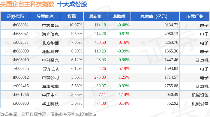央国企自主科技(980083)指数十大成份股详情如下:
