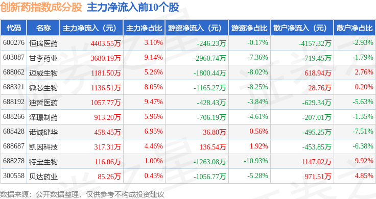 资金流向方面,创新药(980086)指数成份股当日主力资金净流出合计1.86亿元,游资资金净流出合计1.12亿元,散户资金净流入合计2.98亿元。成份股资金流向详情见下表: