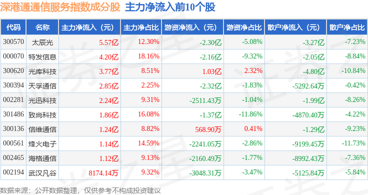 资金流向方面,深港通通信服务(983033)指数成份股当日主力资金净流出合计1.21亿元,游资资金净流入合计2.59亿元,散户资金净流出合计1.38亿元。成份股资金流向详情见下表: