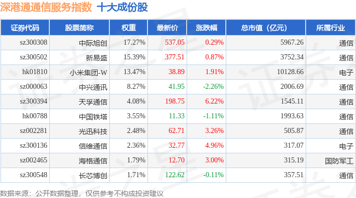 深港通通信服务(983033)指数十大成份股详情如下: