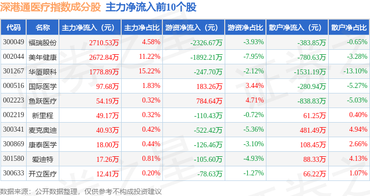 资金流向方面,深港通医疗(983035)指数成份股当日主力资金净流出合计2.24亿元,游资资金净流出合计2064.25万元,散户资金净流入合计2.44亿元。成份股资金流向详情见下表: