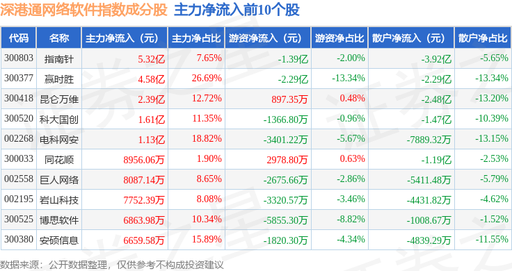 资金流向方面,深港通网络软件(983047)指数成份股当日主力资金净流入合计15.08亿元,游资资金净流出合计8.48亿元,散户资金净流出合计6.6亿元。成份股资金流向详情见下表: