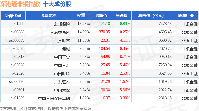 深港通非银(983053)指数十大成份股详情如下:
