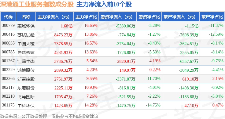 资金流向方面,深港通工业服务(983055)指数成份股当日主力资金净流入合计1.94亿元,游资资金净流出合计1.83亿元,散户资金净流出合计1114.92万元。成份股资金流向详情见下表: