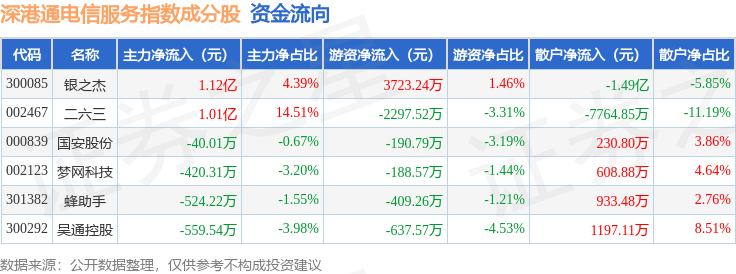 资金流向方面,深港通电信服务(983057)指数成份股当日主力资金净流入合计1.97亿元,游资资金净流出合计0.47万元,散户资金净流出合计1.97亿元。成份股资金流向详情见下表: