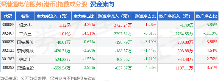 资金流向方面,深港通电信服务(港币)(983058)指数成份股当日主力资金净流入合计1.97亿元,游资资金净流出合计0.47万元,散户资金净流出合计1.97亿元。成份股资金流向详情见下表: