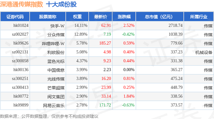 证券之星消息,12月5日,深港通传媒(983075)指数报收于2113.18点,涨0.77%,成交215.15亿元,换手率1.97%。当日该指数成份股中,上涨的有32家,趣致集团以7.95%的涨幅领涨,下跌的有10家,华谊兄弟以2.9%的跌幅领跌。