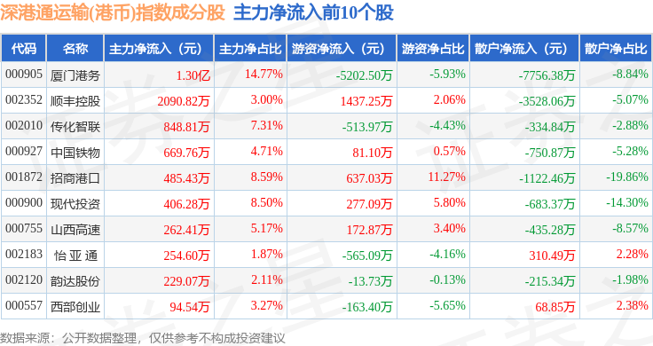资金流向方面,深港通运输(港币)(983078)指数成份股当日主力资金净流入合计5861.23万元,游资资金净流出合计141.27万元,散户资金净流出合计5719.96万元。成份股资金流向详情见下表: