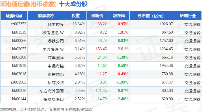 深港通运输(港币)(983078)指数十大成份股详情如下: