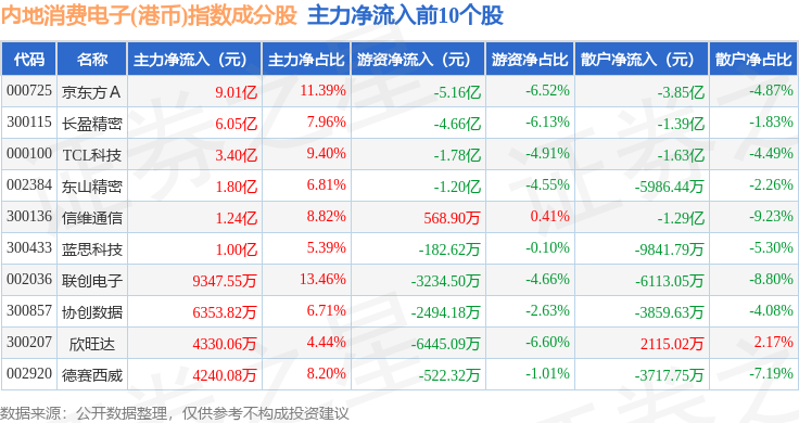 资金流向方面,内地消费电子(港币)(983106)指数成份股当日主力资金净流出合计3.9亿元,游资资金净流出合计5.84亿元,散户资金净流入合计9.74亿元。成份股资金流向详情见下表: