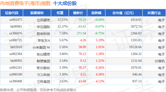 内地消费电子(港币)(983106)指数十大成份股详情如下: