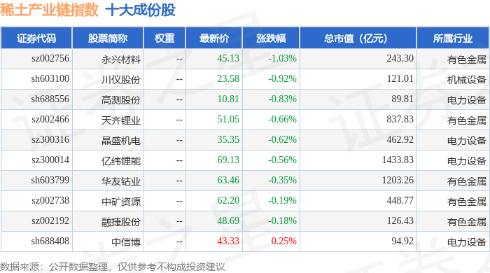 证券之星消息,12月5日,稀土产业链(989013)指数报收于3677.95点,涨1.37%,成交586.7亿元,换手率1.56%。当日该指数成份股中,上涨的有41家,科士达以6.7%的涨幅领涨,下跌的有9家,永兴材料以1.03%的跌幅领跌。