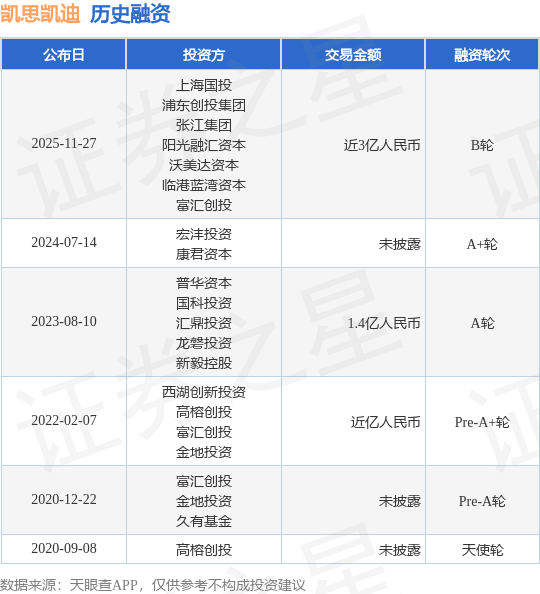 证券之星消息,根据天眼查APP于11月27日公布的信息整理,凯思凯迪(上海)医药科技有限公司B轮融资,融资额近3亿人民币,参与投资的机构包括上海国投,浦东创投集团,张江集团,阳光融汇资本,沃美达资本,临港蓝湾资本,富汇创投。