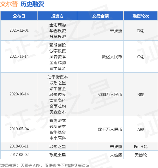 证券之星消息,根据天眼查APP于12月1日公布的信息整理,南京艾尔普再生医学科技有限公司D轮融资,融资额未披露,参与投资的机构包括金雨茂物,华睿投资,分享投资。
