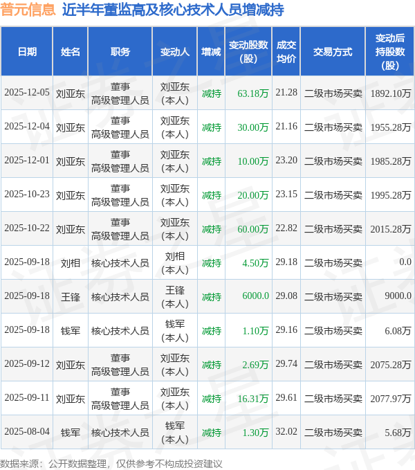 普元信息近半年内的董监高及核心技术人员增减持详情如下: