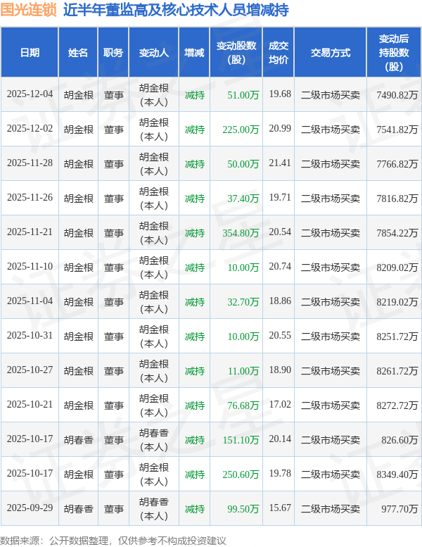 国光连锁近半年内的董监高及核心技术人员增减持详情如下: