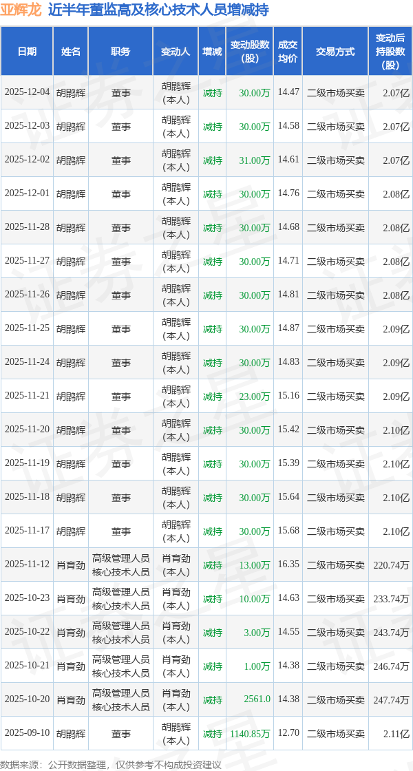 亚辉龙近半年内的董监高及核心技术人员增减持详情如下: