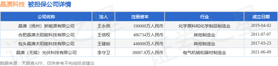 晶澳科技12月4日披露51笔对外担保,被担保公司18家。担保金额排在前十的对外担保明细如下表: