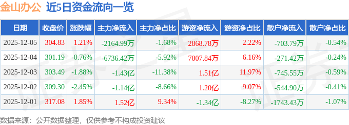 证券之星消息,截至2025年12月5日收盘,金山办公(688111)报收于304.83元,上涨1.21%,换手率0.92%,成交量4.28万手,成交额12.92亿元。