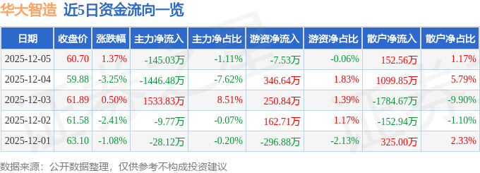 证券之星消息,截至2025年12月5日收盘,华大智造(688114)报收于60.7元,上涨1.37%,换手率0.53%,成交量2.18万手,成交额1.31亿元。