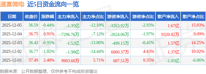 证券之星消息,截至2025年12月5日收盘,通富微电(002156)报收于36.59元,下跌0.44%,换手率2.01%,成交量30.49万手,成交额11.13亿元。