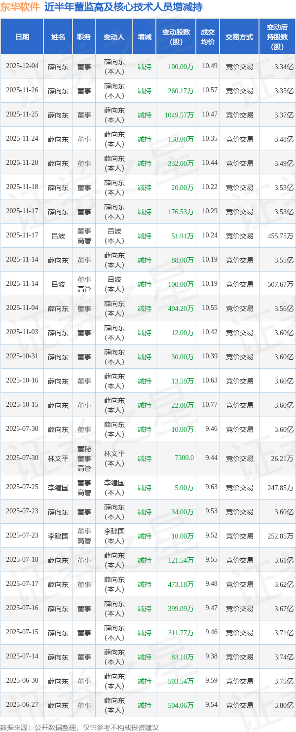 东华软件近半年内的董监高及核心技术人员增减持详情如下: