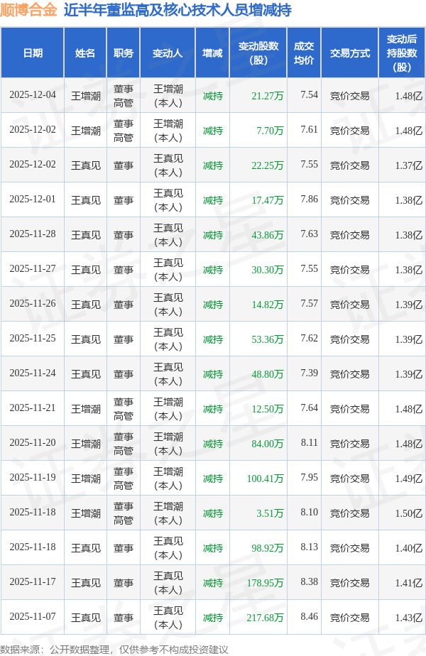 顺博合金近半年内的董监高及核心技术人员增减持详情如下: