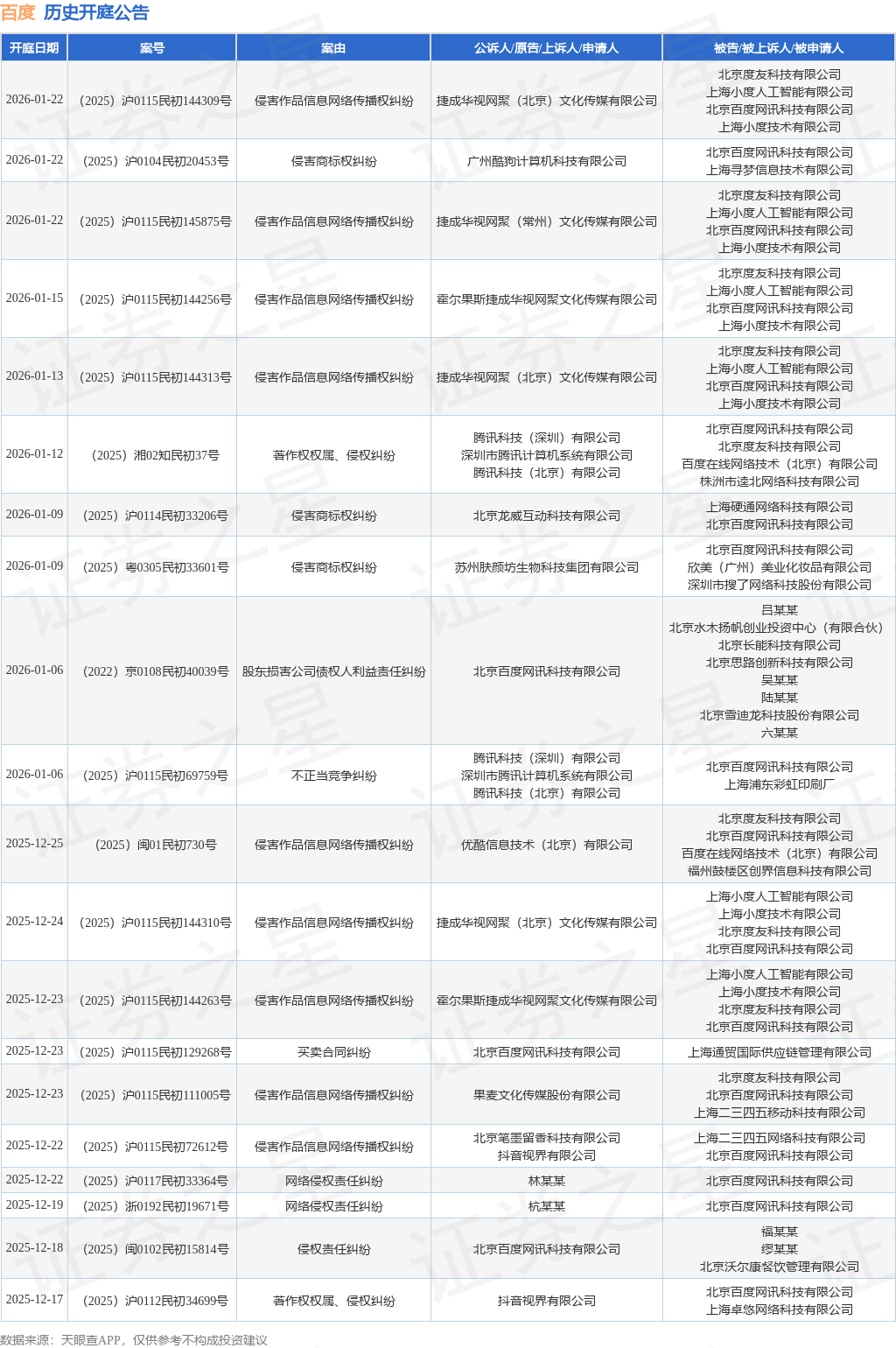 案号:(2025)闽0583民初11852号根据统计,近一年内以北京百度网讯科技有限公司为当事人的历史开庭公告有304则,其中案由为“侵害商标权纠纷”的公告以83则居首,其次为“不正当竞争纠纷”有50则,“侵害作品信息网络传播权纠纷”有49则。历史开庭公告(前20条)如下: