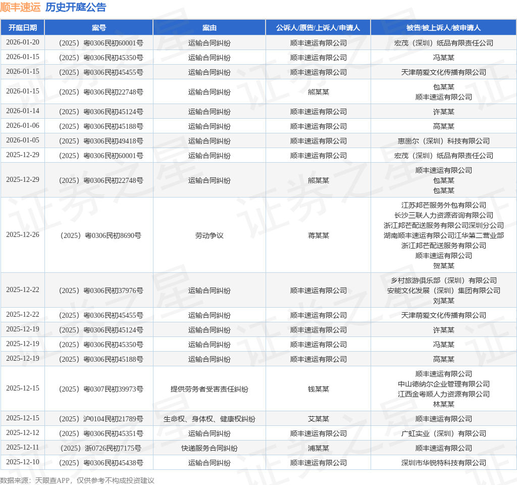 案号:(2025)粤0306民初8690号根据统计,近一年内以顺丰速运有限公司为当事人的历史开庭公告有178则,其中案由为“运输合同纠纷”的公告以61则居首,其次为“快递服务合同纠纷”有29则,“买卖合同纠纷”有20则。历史开庭公告(前20条)如下: