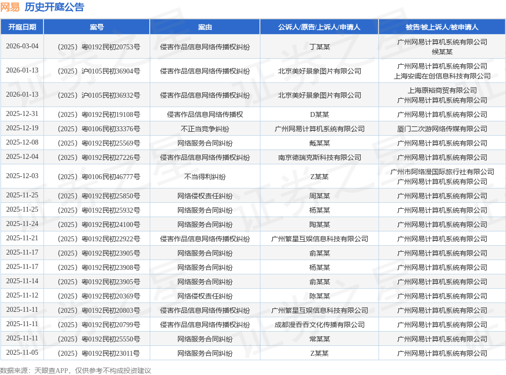案号:(2025)粤0192民初25569号根据统计,近一年内以广州网易计算机系统有限公司为当事人的历史开庭公告有348则,其中案由为“网络服务合同纠纷”的公告以123则居首,其次为“侵害作品信息网络传播权纠纷”有105则,“网络侵权责任纠纷”有50则。历史开庭公告(前20条)如下: