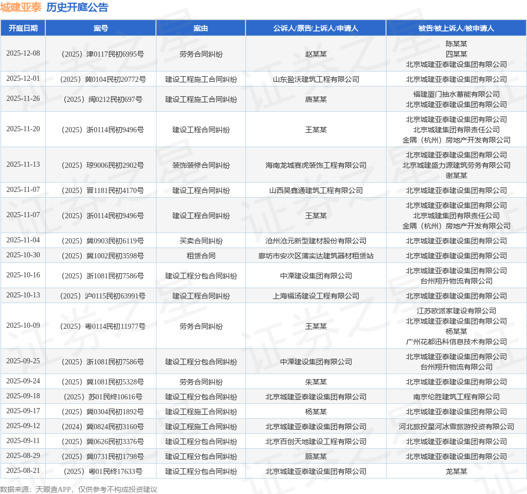 案号:(2025)津0117民初6995号根据统计,近一年内以北京城建亚泰建设集团有限公司为当事人的历史开庭公告有150则,其中案由为“建设工程施工合同纠纷”的公告以46则居首,其次为“建设工程分包合同纠纷”有25则,“建设工程合同纠纷”有20则。历史开庭公告(前20条)如下: