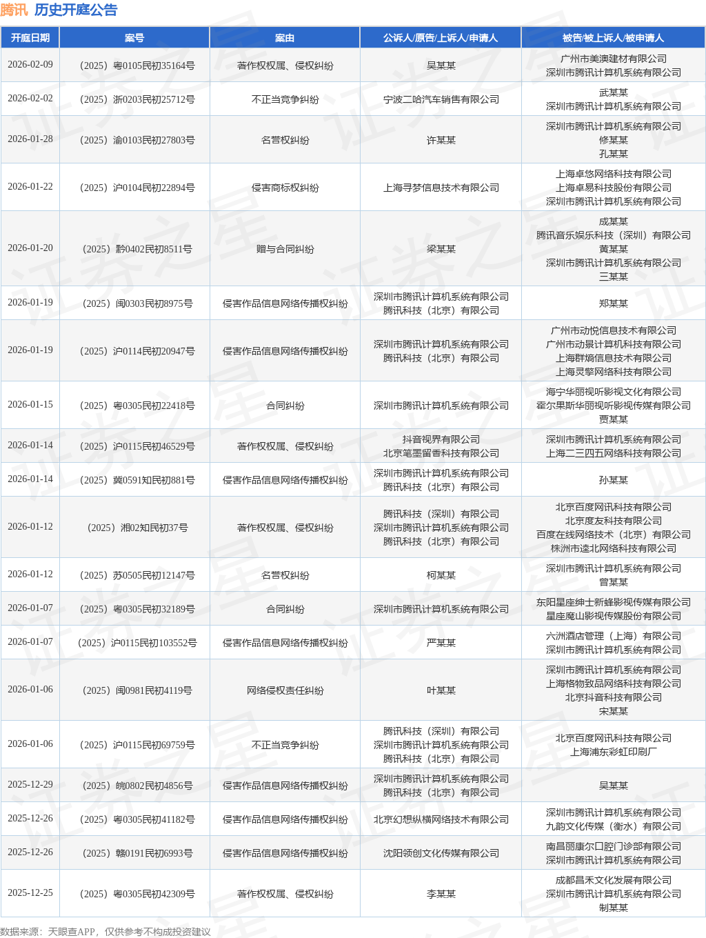 案号:(2024)沪0104民初26107号根据统计,近一年内以深圳市腾讯计算机系统有限公司为当事人的历史开庭公告有1147则,其中案由为“侵害作品信息网络传播权纠纷”的公告以397则居首,其次为“著作权权属、侵权纠纷”有106则,“名誉权纠纷”有105则。历史开庭公告(前20条)如下: