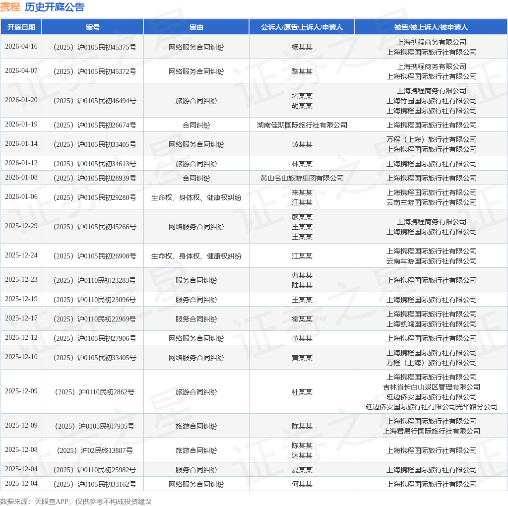 案号:(2025)沪02民终13887号根据统计,近一年内以上海携程国际旅行社有限公司为当事人的历史开庭公告有224则,其中案由为“旅游合同纠纷”的公告以74则居首,其次为“网络服务合同纠纷”有67则,“服务合同纠纷”有64则。历史开庭公告(前20条)如下: