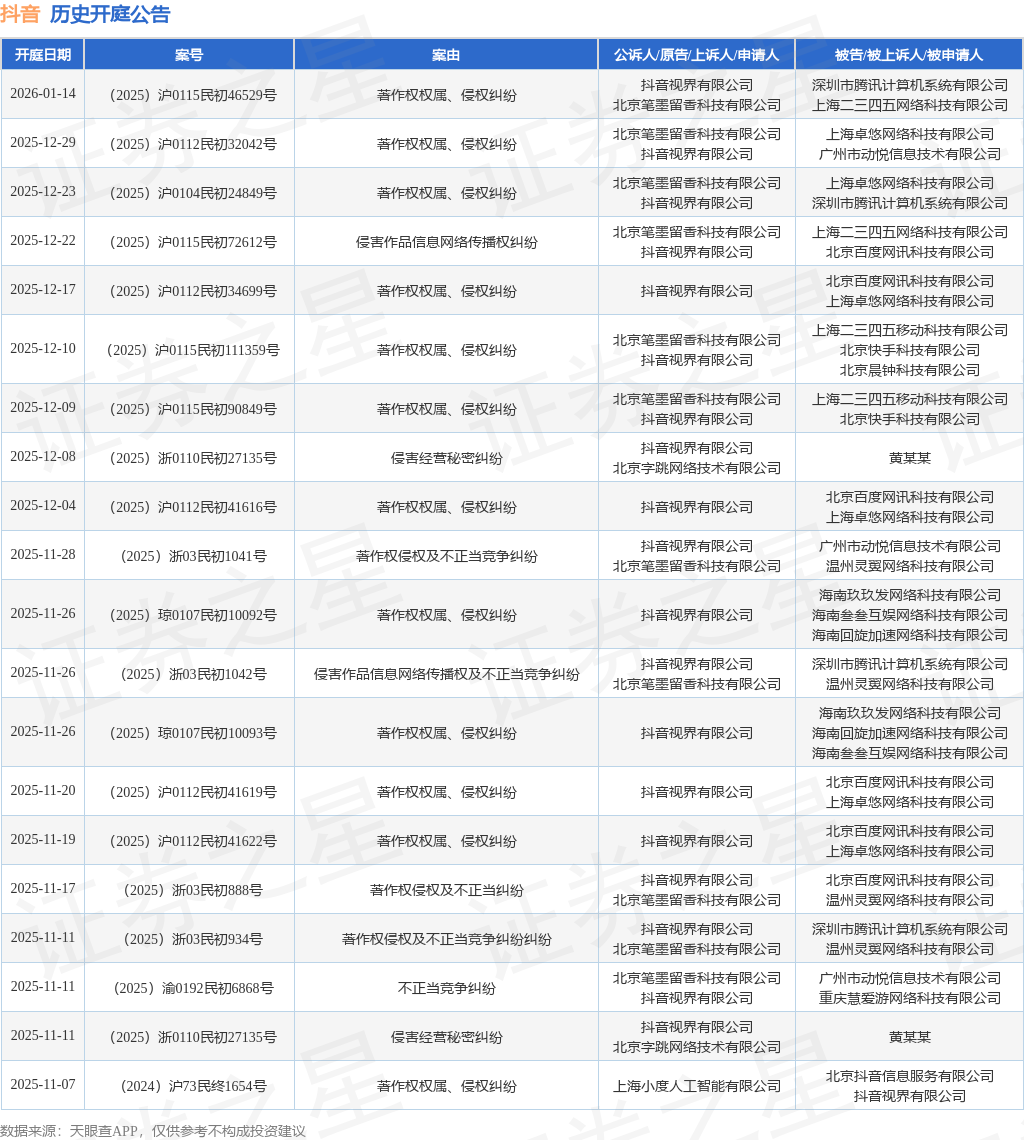 案号:(2025)浙0110民初27135号根据统计,近一年内以抖音视界有限公司为当事人的历史开庭公告有121则,其中案由为“著作权权属、侵权纠纷”的公告以45则居首,其次为“侵害作品信息网络传播权纠纷”有38则,“不正当竞争纠纷”有11则。历史开庭公告(前20条)如下: